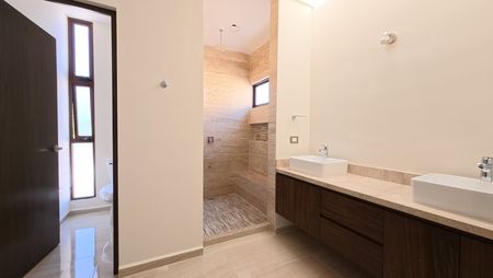 Recámara principal con closet vestidor, baño y terraza con vista a la piscina